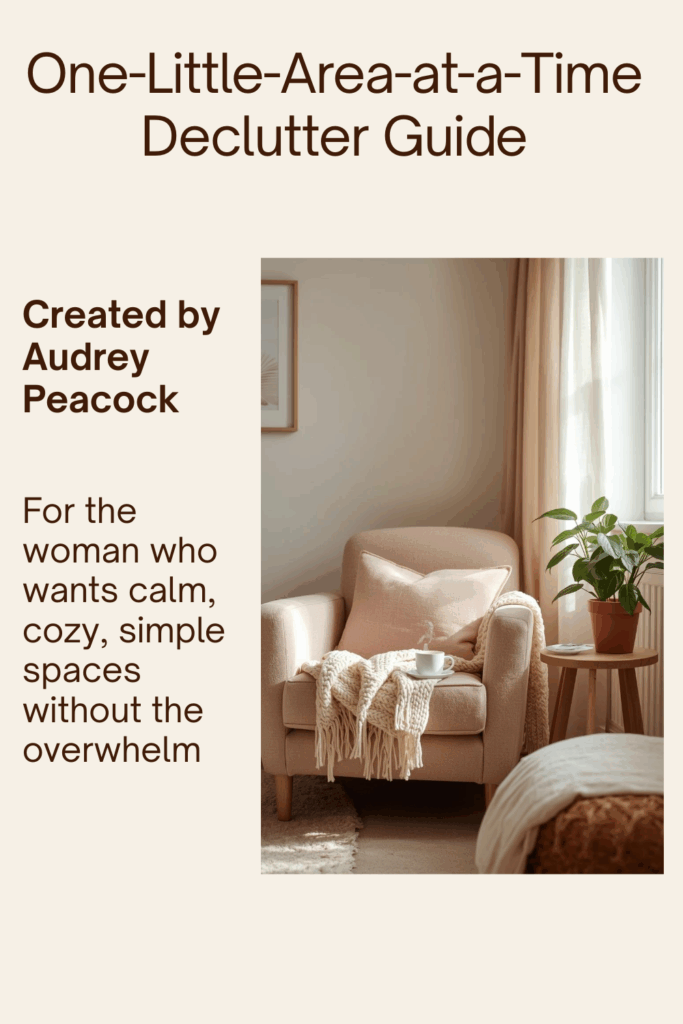 I created the One-Little-Area-at-a-Time Declutter Guide for women who want their home to feel lighter, calmer, and more peaceful — without turning it into a full-time job. No color-coded tubs. No guilt. No marathon cleaning days. Just simple steps, tiny wins, and a whole lot of encouragement.