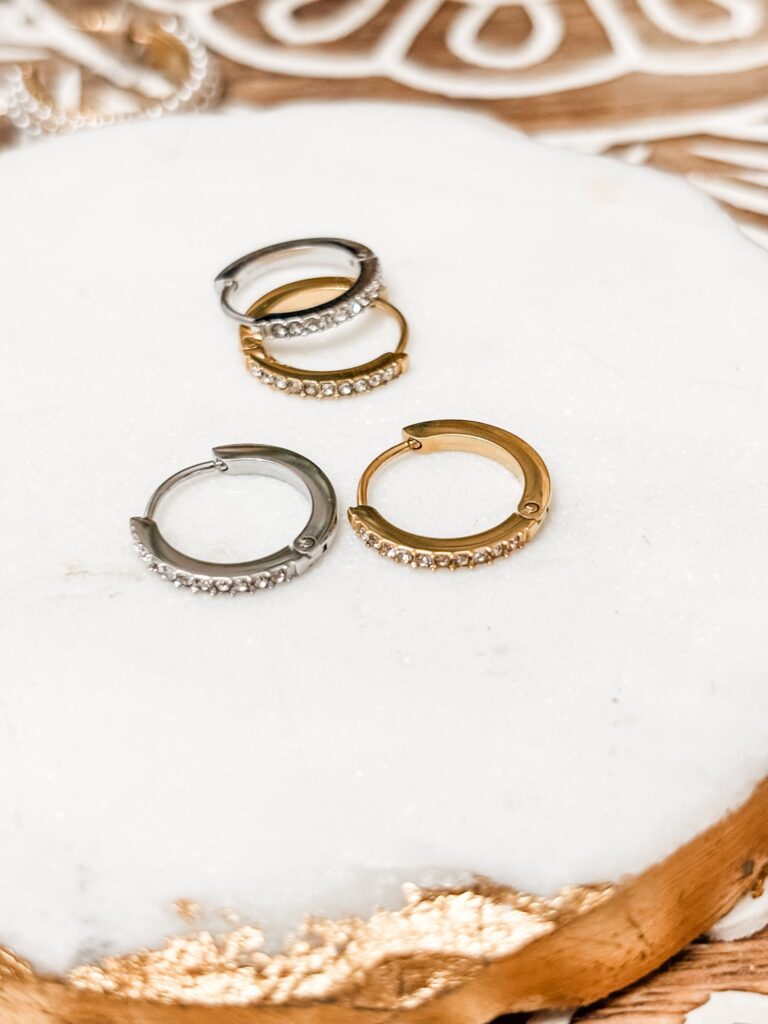 Try this: Jovie Hoops — small hoops with big sparkle. These crystal-lined beauties catch the light just right and play nicely with any stack.
