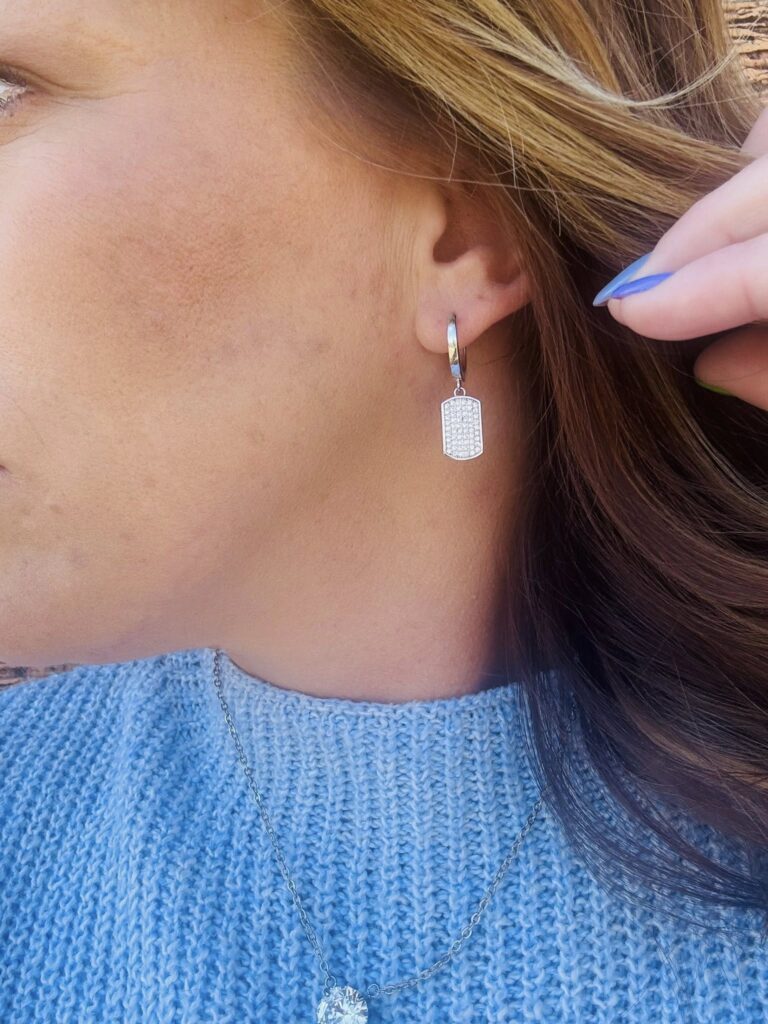 Try this: Maci Earrings — an infinity-style hoop with a tag-shaped charm covered in crystals. Lightweight, versatile, and designed to dazzle.