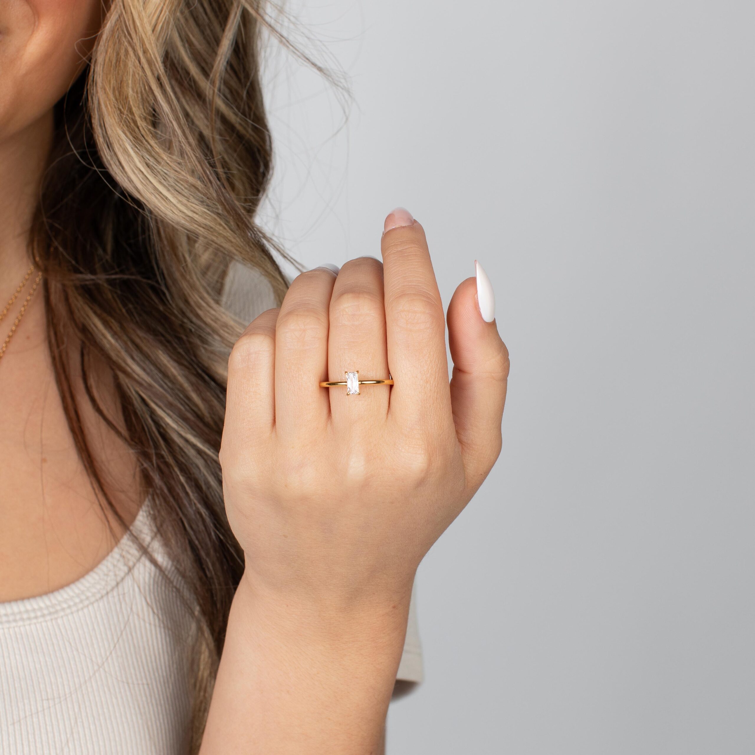 Delicate, dainty, and perfectly charming—the $20 Cleo Ring features a sleek band with a rectangular zircon crystal.