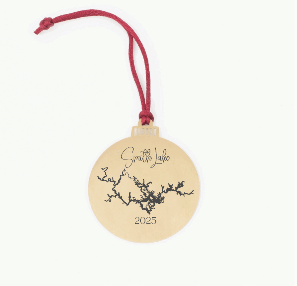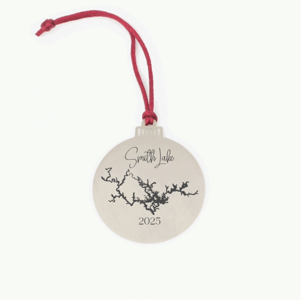 Each ornament features a detailed outline of Smith Lake, engraved on your choice of stainless steel or gold-tone metal.