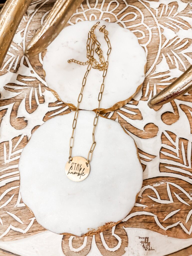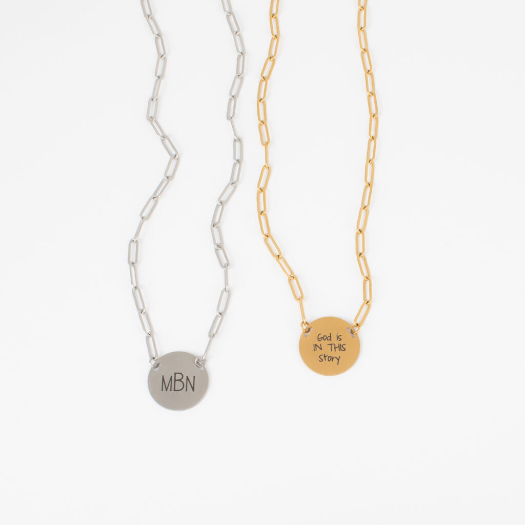 If you love simple, polished style with just a touch of personal sentiment, this one will make your heart flutter a little. It is available in stainless or gold stainless, has that sleek oval link chain, and the sweetest matte disc that you get to customize. A name, a word, initials, a tiny phrase that means something to you… it becomes whatever story you want it to tell.
